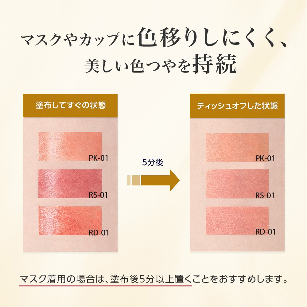 - 【色落ちしにくいマスクプルーフ】マスクやカップへの色移りが目立ちにくい口紅です。唇の水分と反応してジェル膜に変化。ぴたっと密着し、つやオイルが唇をコーティングします。