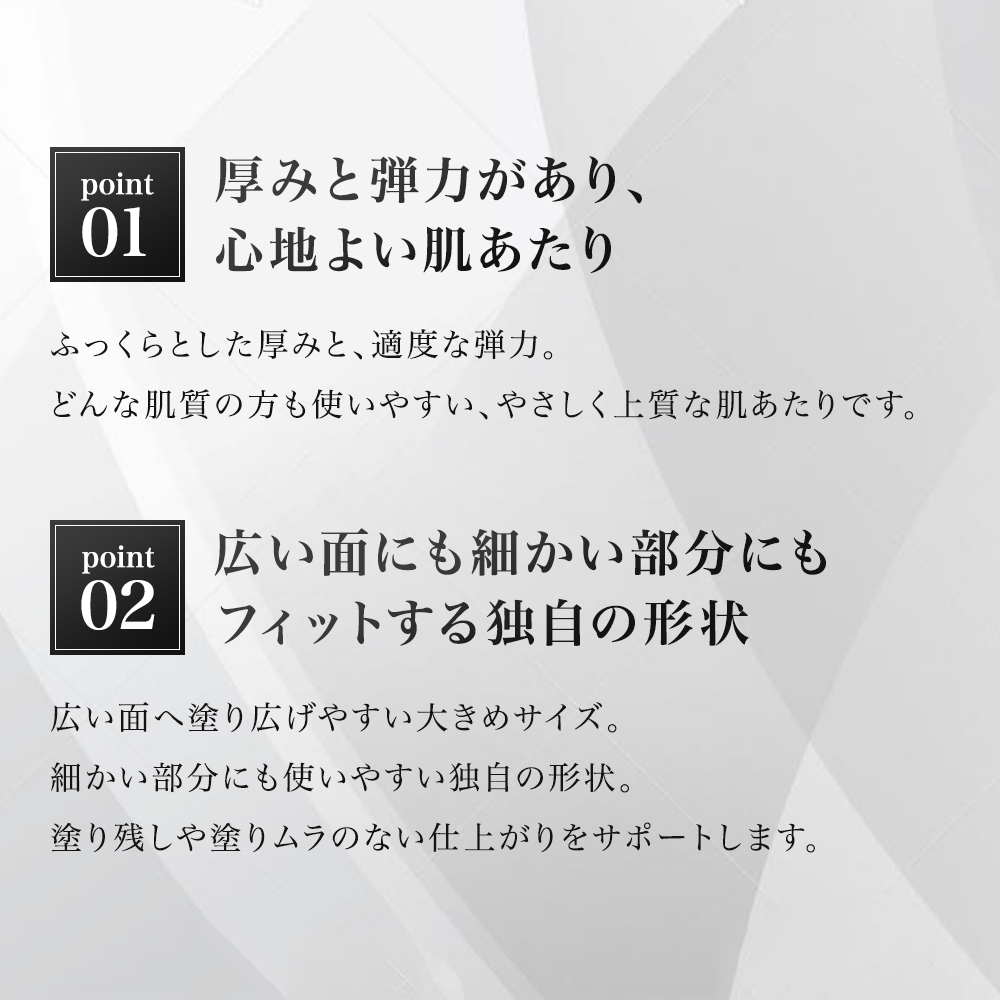 - 【心地よい肌あたり】エマルションメイクに最適で、どんな肌質の方も使いやすいやさしく上質な使用感。トントンと肌にパッティングさせて使いやすいようふっくらとした厚みと、かたすぎずやわらかすぎない適度な弾力で、のばしやすさと肌あたりのやさしさを両立しました。