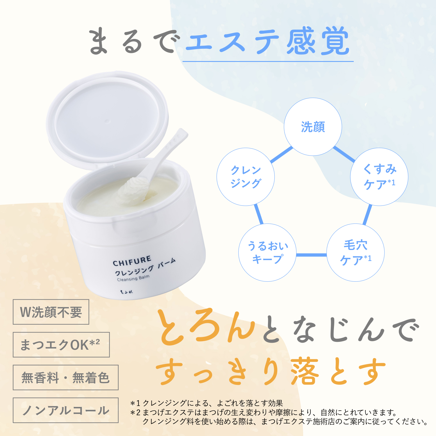 まつげエクステをされている方もお使いいただけます*5。無香料、無着色、ノンアルコール(アルコールフリー)です。*5 まつげエクステンションはまつげの生え変わりや摩擦により、自然にとれていきます。クレンジング料を使い始める際はまつげエクステンション施術店のご案内に従ってください。