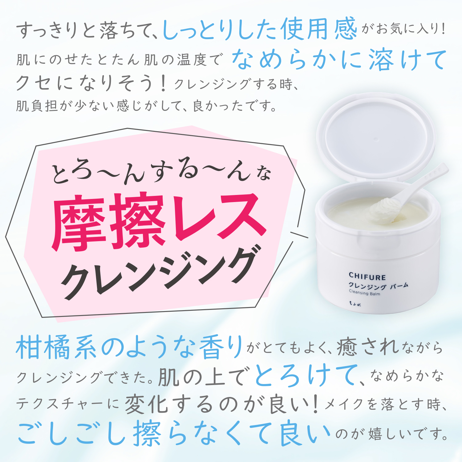 - 【とろけてなじむテクスチャー】とろけるバームが肌のうえでなめらかになじみます。メイクを落とす作業になりがちなクレンジングの時間も、まるでエステ感覚で“特別な時間”としてお楽しみいただけるような、とろけるような使用感にこだわりました。