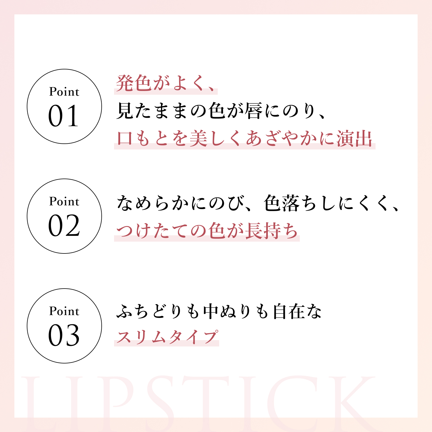 - 【落ちにくい】色持ちがいい、長時間つけたての仕上がりをキープするリップカラーです。