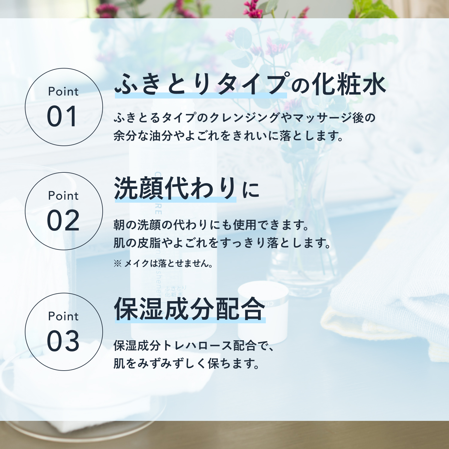 - 【ふきとり専用の化粧水】クレンジングやマッサージ後の余分な油分を溶かしながら落とす、ふき取り化粧水。肌に負担をかけずに、すっきりとふき取れます。