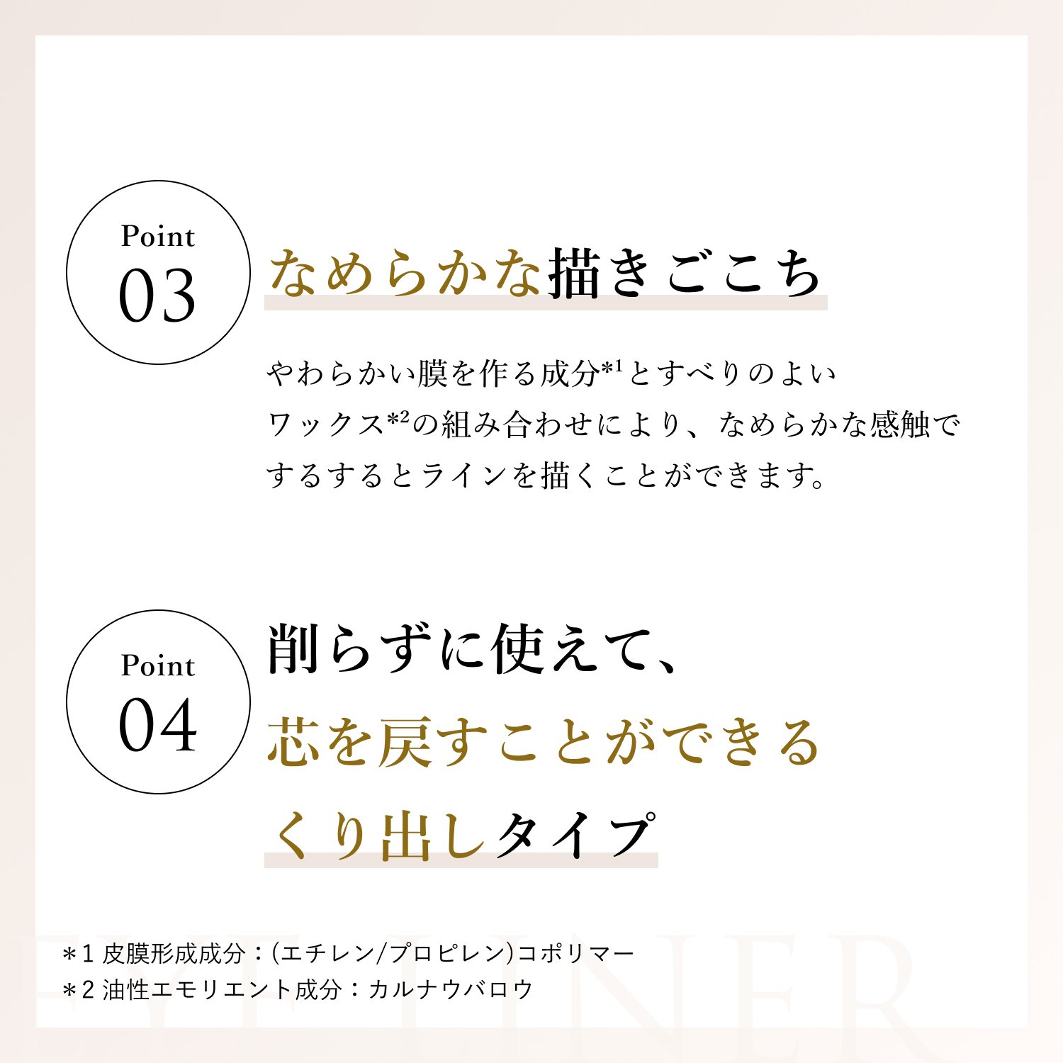 - 【目元がしっかり際立つ】まつ毛の間を埋めやすい太芯タイプで、くっきりとした目元に仕上がります。