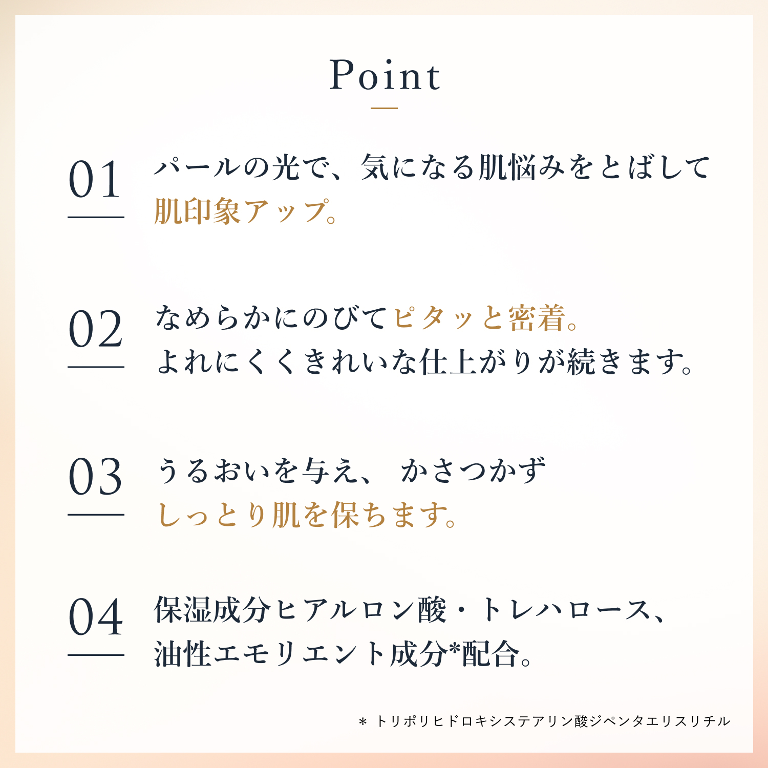 - パウダータイプのファンデーションをお使いの場合はファンデーションの前に、リキッドまたはクリームタイプのファンデーションをお使いの場合はファンデーションのあとにお使いください。