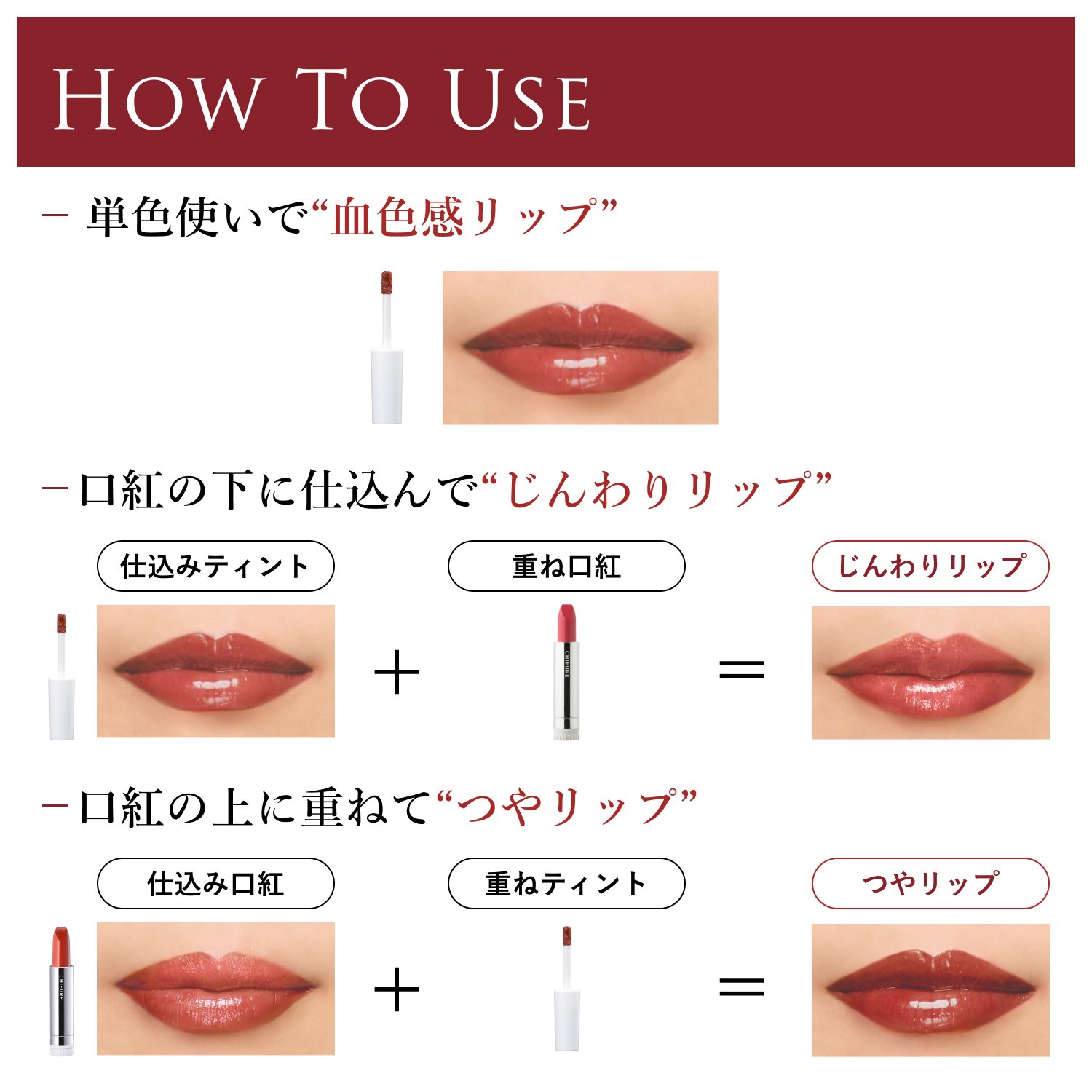- 【使い方いろいろ】1本で3つの使い方。単色・仕込み使いで、飲んでも食べても長時間淡いピンク色の血色感を維持します。お使いのリップの上に重ねて使うと、グロスのようなつやとニュアンスチェンジをお楽しみいただけます。