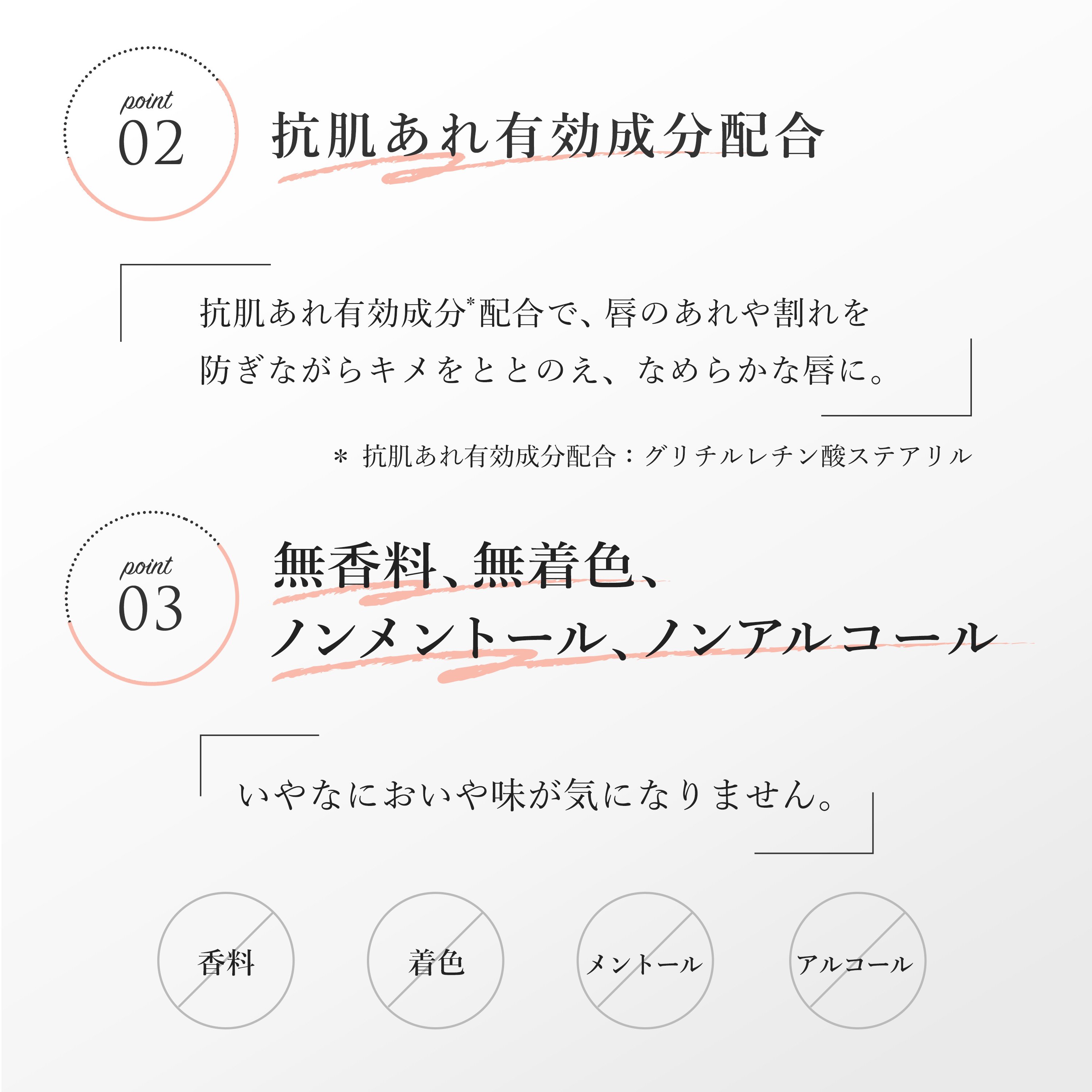 - 【抗肌あれ有効成分配合】グリチルレチン酸ステアリル配合。唇のあれ・ひび割れを防ぎながらキメをととのえ、なめらかなくちびるに。