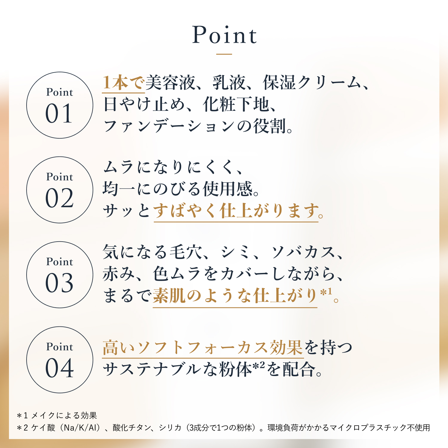 - 【カバー力とナチュラルな仕上がりを両立】気になる毛穴、シミ、ソバカス、赤み、色ムラをカバーしながら、まるで素肌のような自然な仕上がり*1。高いソフトフォーカス効果を持つサステナブルな粉体*2を配合し、毛穴レスなつるんとつや肌に。