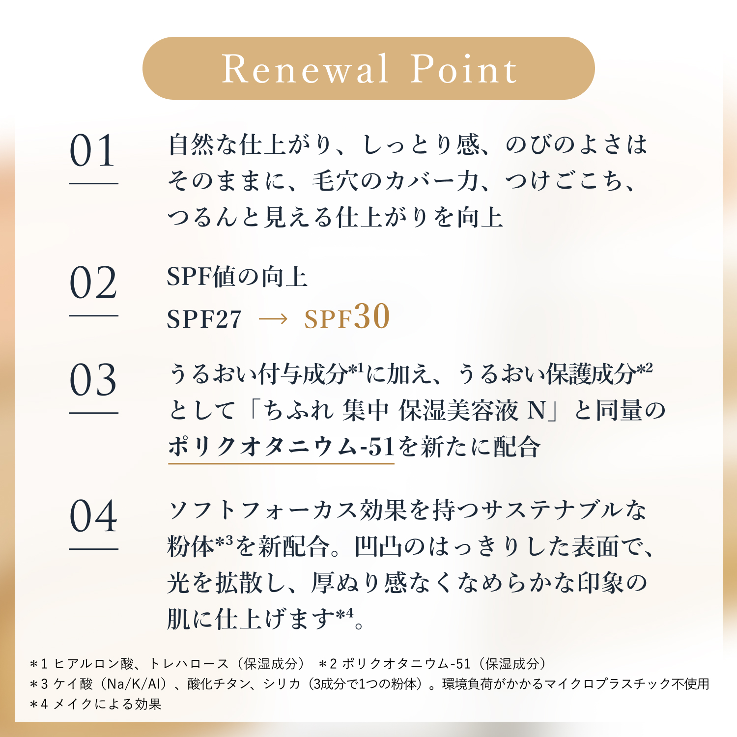 - 【美容液成分配合】うるおい付与成分*3と、「ちふれ 集中 保湿美容液 N」と同量のうるおい保護成分*4を配合。乾燥を防ぎ、しっとりとした肌を保ちます。