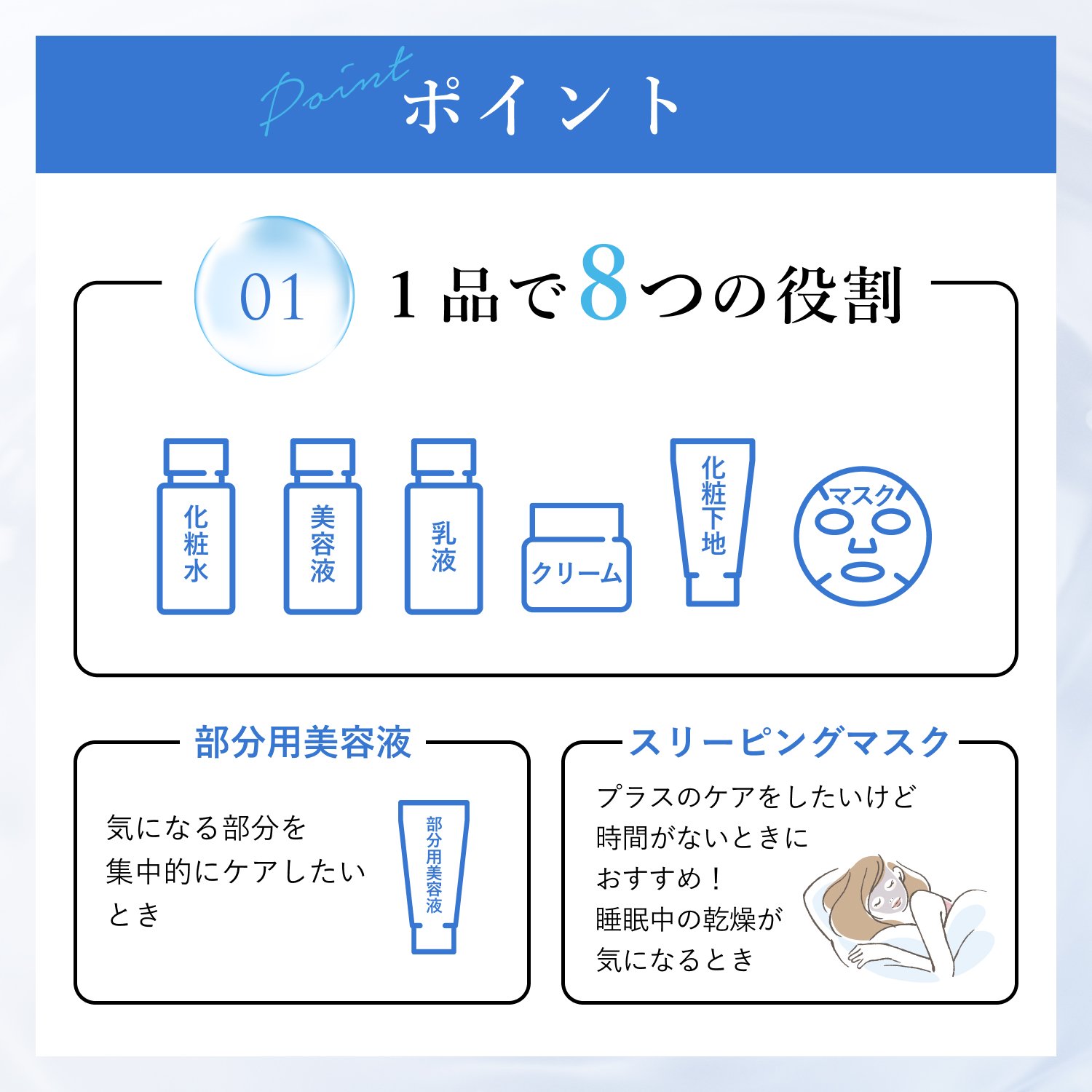 - 【1品で8つの役割】ベーシックな5つの役割(化粧水・美容液・乳液・クリーム・化粧下地)+スペシャルケアとして3つの役割(部分用美容液・マスク・スリーピングマスク)。 様々な場面で使えるマルチなスキンケアアイテムです。