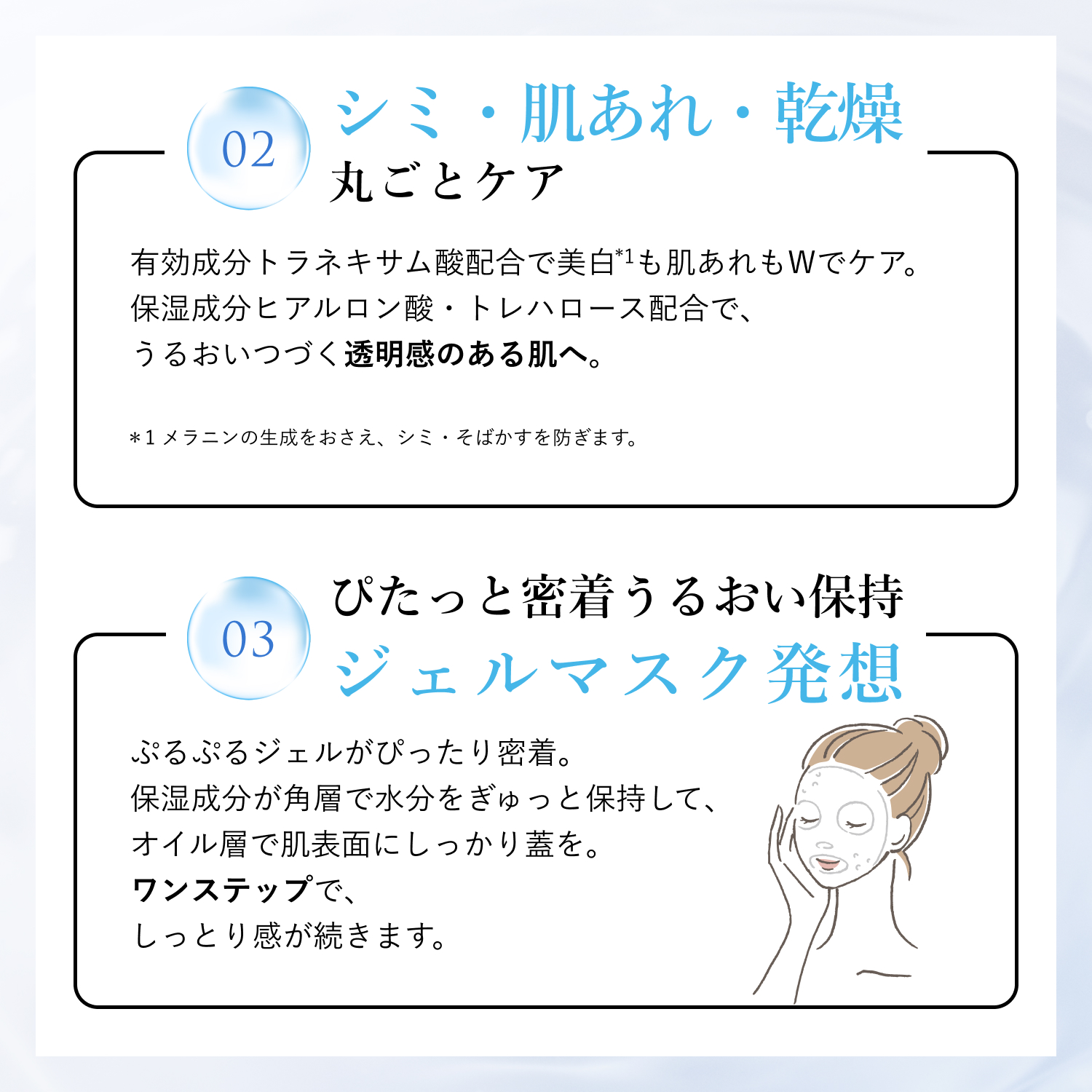 - 【うるおいつづく使用感】みずみずしいジェルが角層のすみずみまでうるおいを届けて、簡単ワンステップでていねいにお手入れしたようなしっとり感が長く続きます。保湿成分ヒアルロン酸・トレハロースに加えて、「ふっくらうるおい成分*1」「肌やわらか成分*2」新配合。べたつかず心地よいテクスチャーと、あと肌のやわらかさにこだわりました。 “ジェルマスク”発想だから、水分たっぷりのジェルを肌の上に乗せた瞬間からぴったり密着して、うるおい開始。保湿成分が角層で水分をぎゅっと保持して、オイル層が肌表面にしっかり蓋をします。