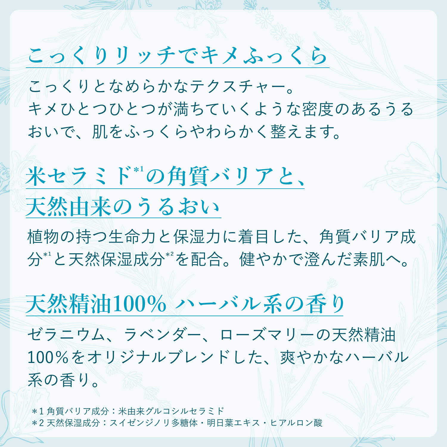 - 【米セラミド*1の角質バリアと、天然由来のうるおい】植物の持つ生命力と保湿力に着目した、角質バリア成分*1と天然保湿成分*2を配合。濃密なうるおいが肌を包み込んで守り、健やかで澄んだ素肌へ。