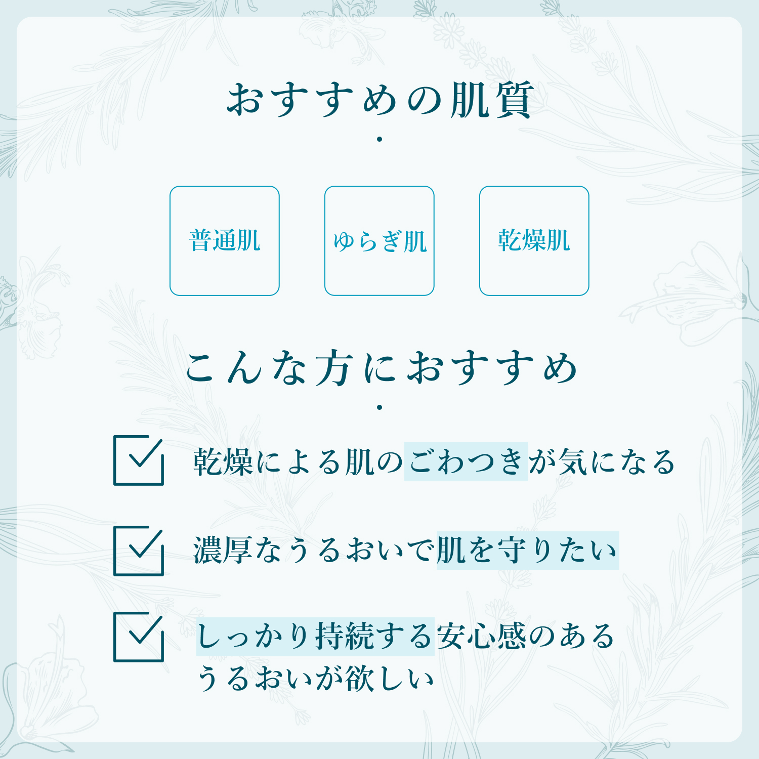 こっくりとなめらかにのび、肌のうるおいをしっかり閉じ込めます。