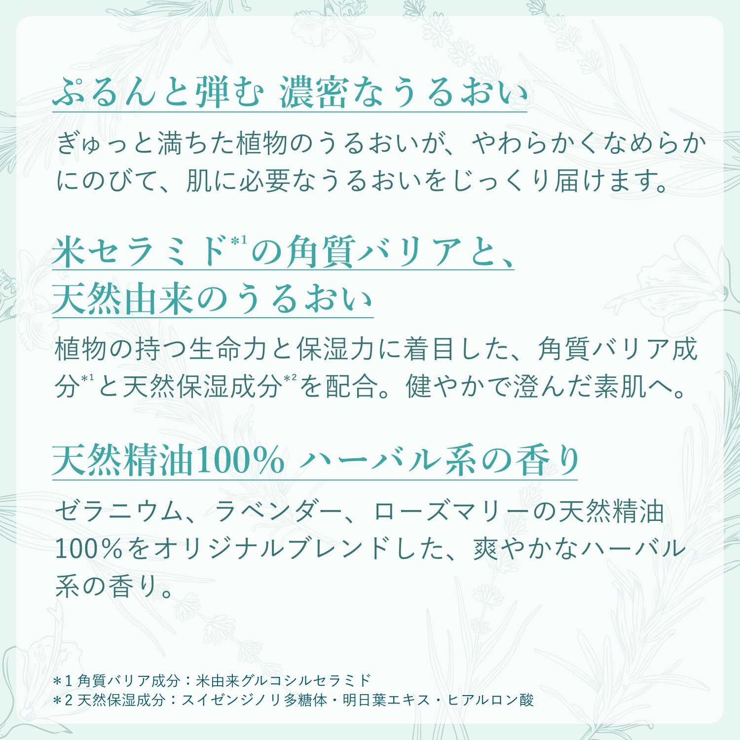 - 【米セラミド*1の角質バリアと、天然由来のうるおい】植物の持つ生命力と保湿力に着目した、角質バリア成分*1と天然保湿成分*2を配合。濃密なうるおいが肌を包み込んで守り、健やかで澄んだ素肌へ。