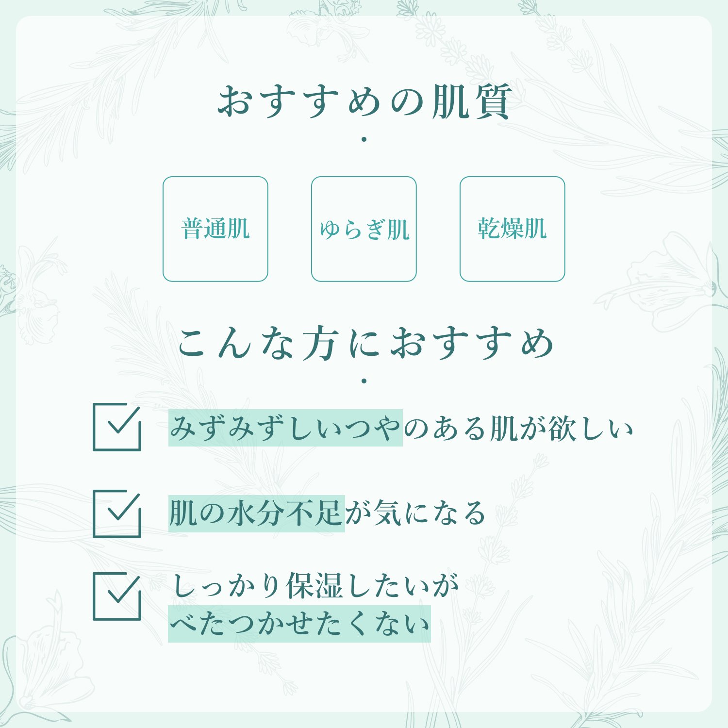 やわらかくなめらかにのびて、肌に必要なうるおいをじっくり補います。