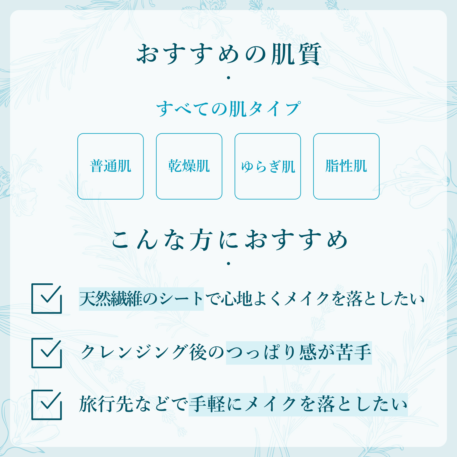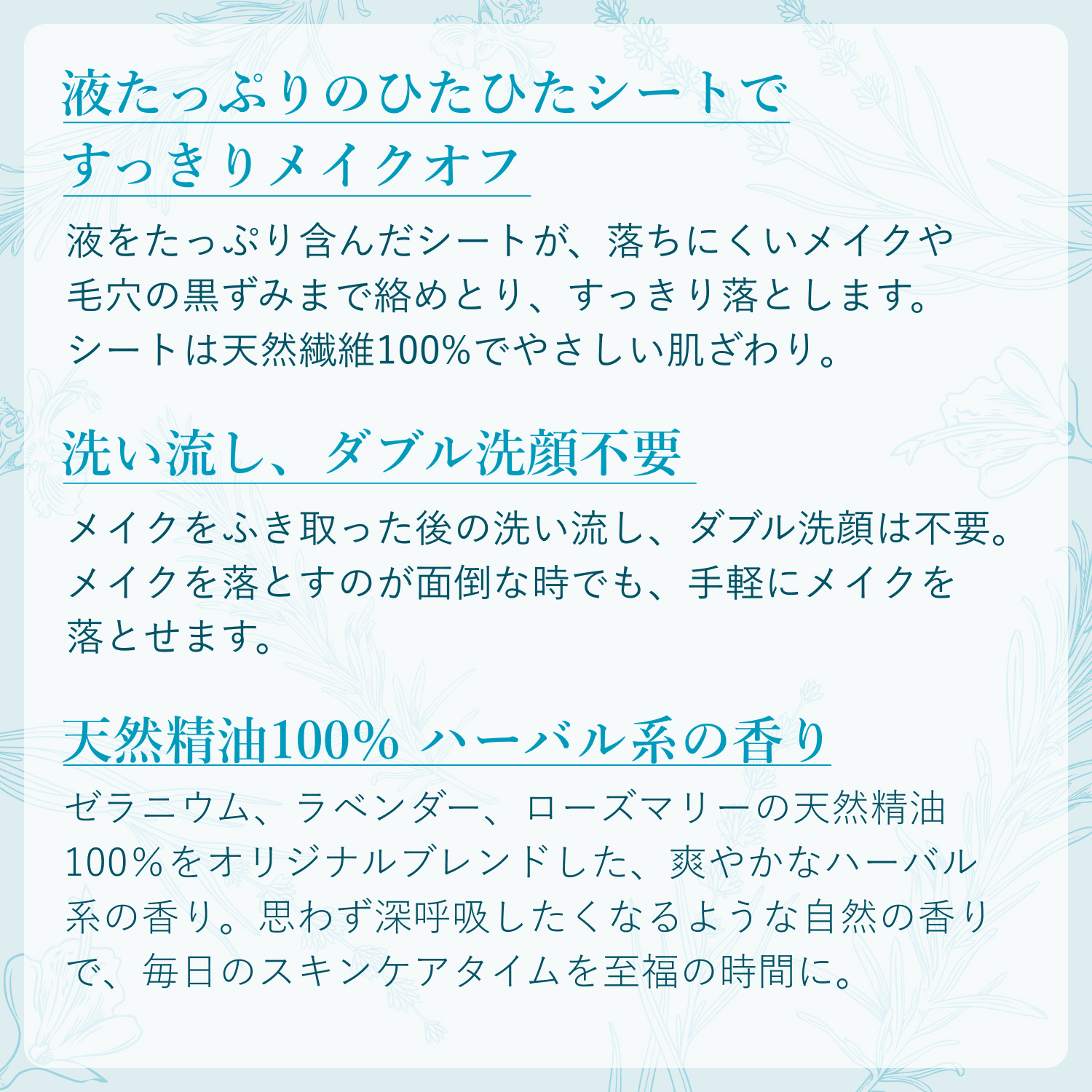 うるおいをたっぷり含んだシートで落ちにくいメイクや毛穴の黒ずみまで絡めとり、スッキリ落とします。 天然保湿成分がジュワッとしみ出し、ふきとり後はつっぱらずにうるおい感のある肌に。 ダブル洗顔不要。まつげエクステをしている方もお使いいただけます。朝の洗顔のかわりとしても。