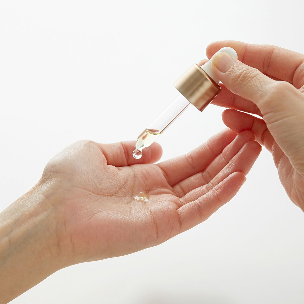 - 化粧水の前に、適量(顔全体で3滴程度)を手にとり、顔全体にやさしくのばします。