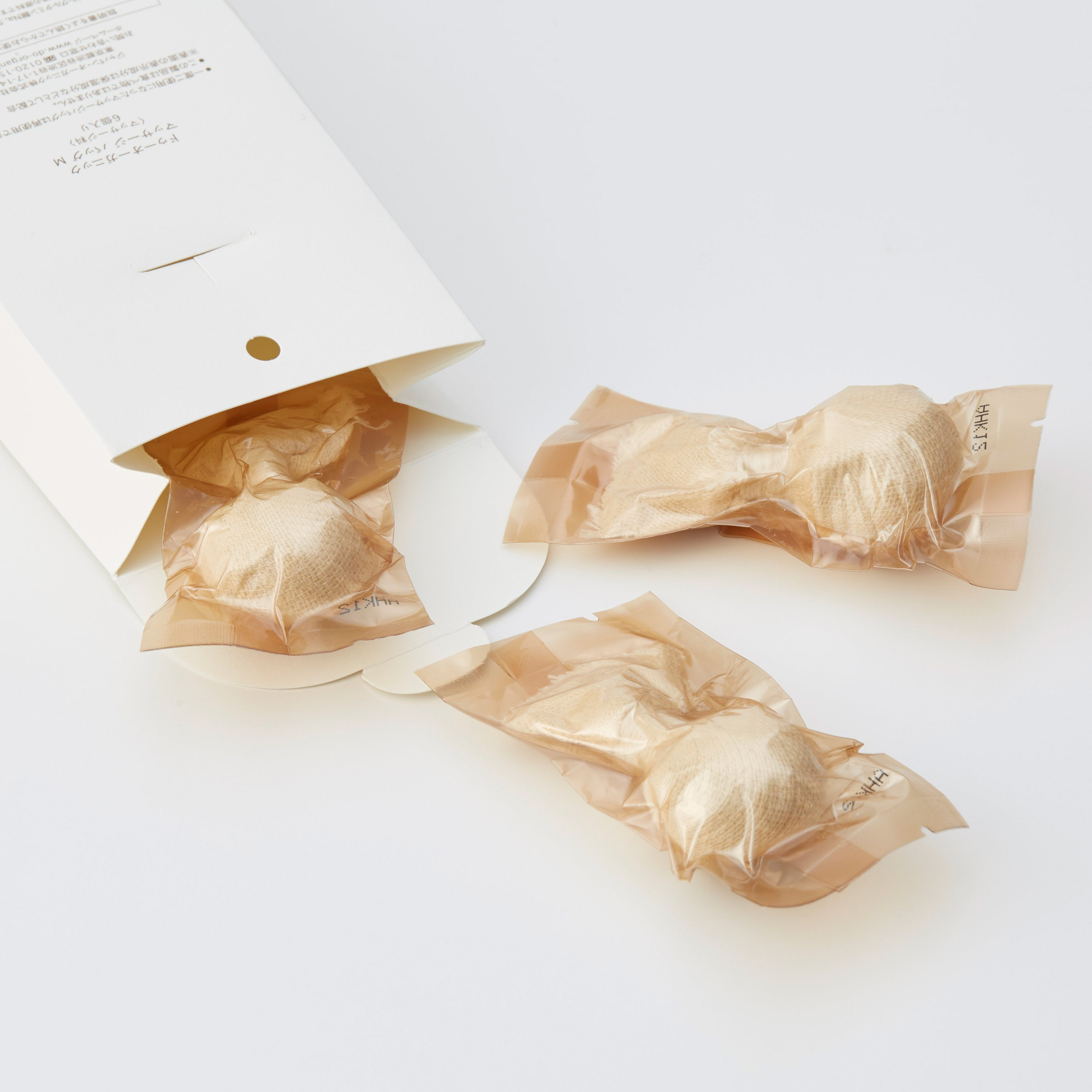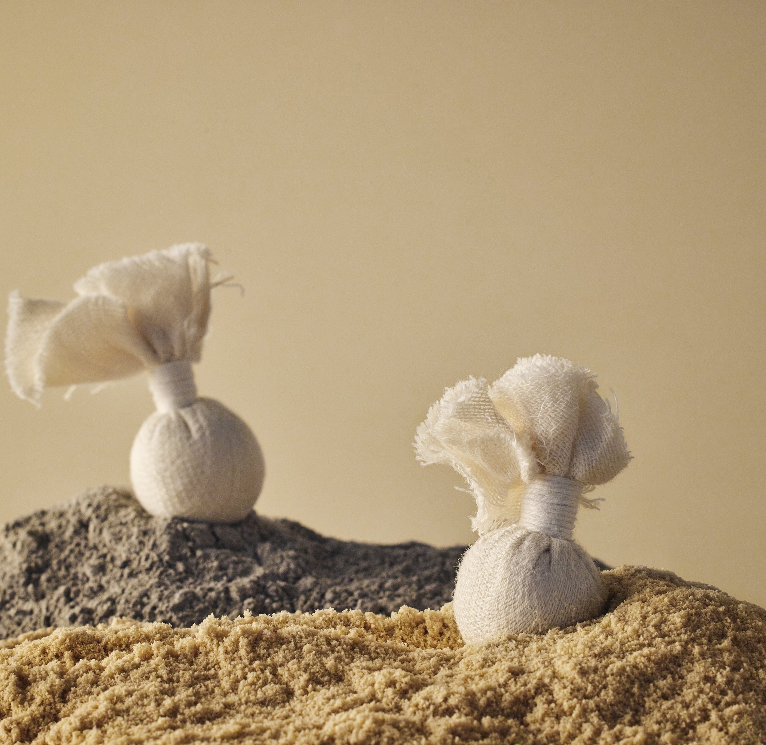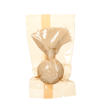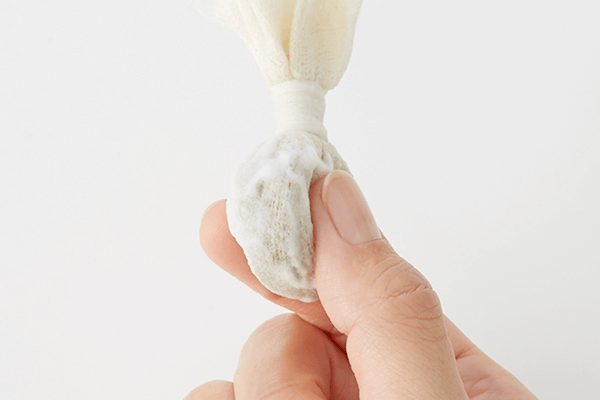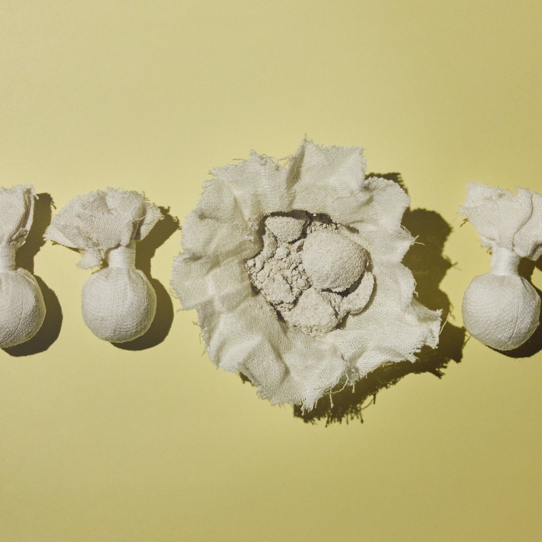 丁寧に織り上げた繊細なオーガニックコットンガーゼを重ねて、ふんわりとやわらかな肌あたりに仕上げています。米ぬかパウダー*1やクレイパウダー*2をボール状に包み、紐でまとめ上げるところまで、すべて日本の職人がひとつひとつ丁寧に手作りしたもの。手仕事の温かみを感じる風合いと、どこまでも肌にやさしい感触にこだわりました。