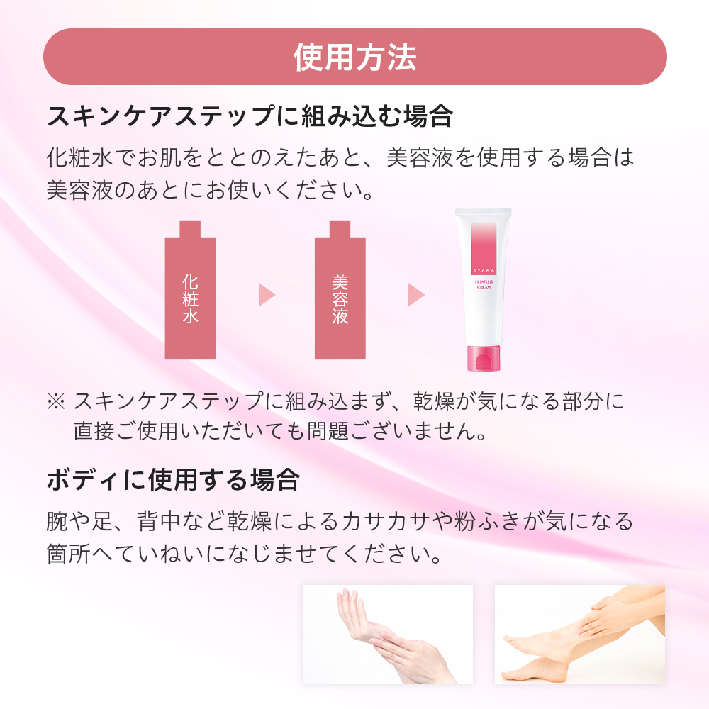 - 適量を手にとり、乾燥が気になる部分にやさしくのばしなじませます。(顔に使用する場合は真珠粒大程度)
