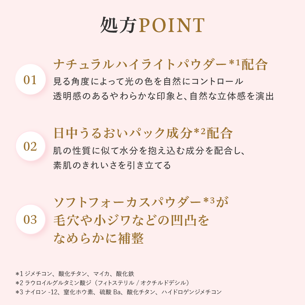 - 【光の効果で厚塗り感なくトーンアップ&カバー】ソフトフォーカスパウダー*1が毛穴や小ジワなどの凹凸をなめらかに補整し、ナチュラルハイライトパウダー*2が光の効果で厚塗り感なくトーンアップ&カバーします。透明感*3・血色感のあるやわらかな肌印象と自然な立体感を演出します。