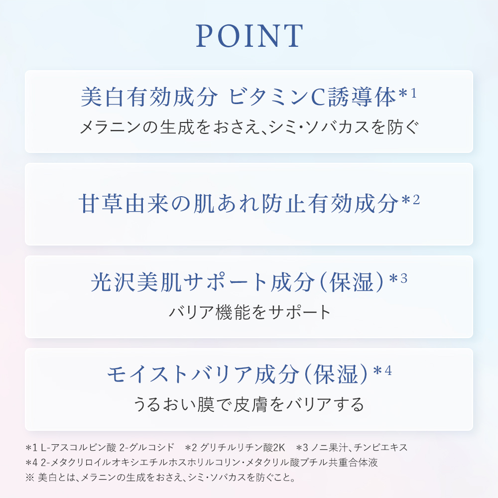 - 【2つの薬用有効成分+光沢美肌サポート成分配合】角層のすみずみに2つの薬用有効成分*1*2と独自の皮膚科学研究に基づく光沢美肌サポート成分*3がスッと浸透。キメふっくら、ハリと透明感あふれる素肌へ導きます。