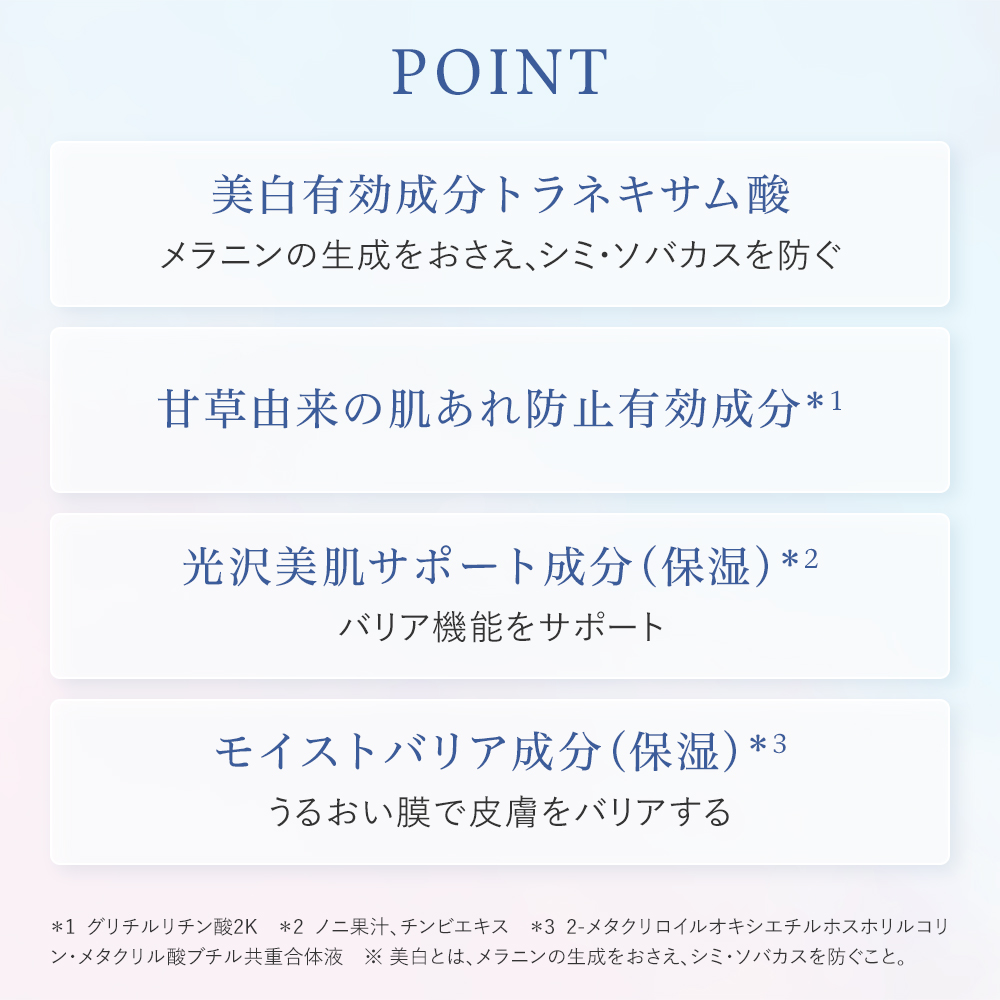 - 【美白&肌あれ防止の2種有効成分配合】美白有効成分*1と甘草由来の肌あれ防止有効成分*2を配合。また、独自の皮膚科学研究に基づく光沢美肌サポート成分*3がスッと浸透し、うるおいとハリに満ちた肌へ導きます。
