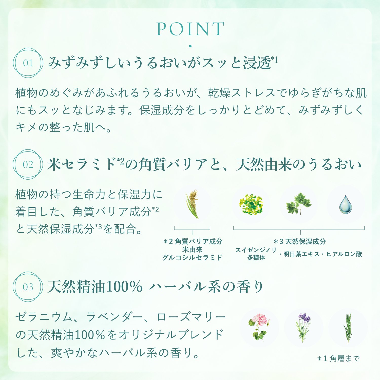 植物の持つ生命力と保湿力に着目した、角質バリア成分*1と天然保湿成分*2を配合。