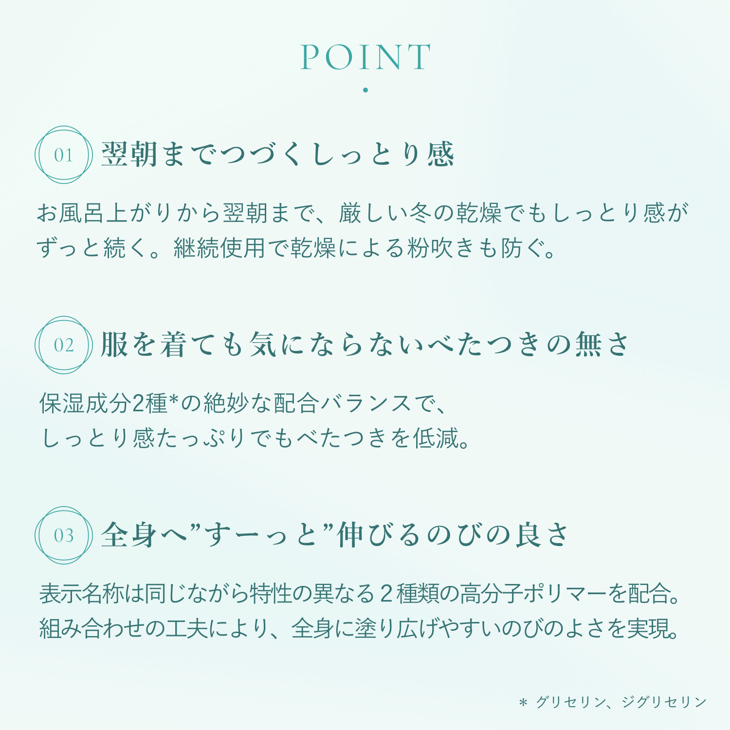 - 【服を着ても気にならないべたつきの無さ】保湿成分の組み合わせ・比率の工夫により、しっとりするのにべたつかない使いごごちを実現しました。