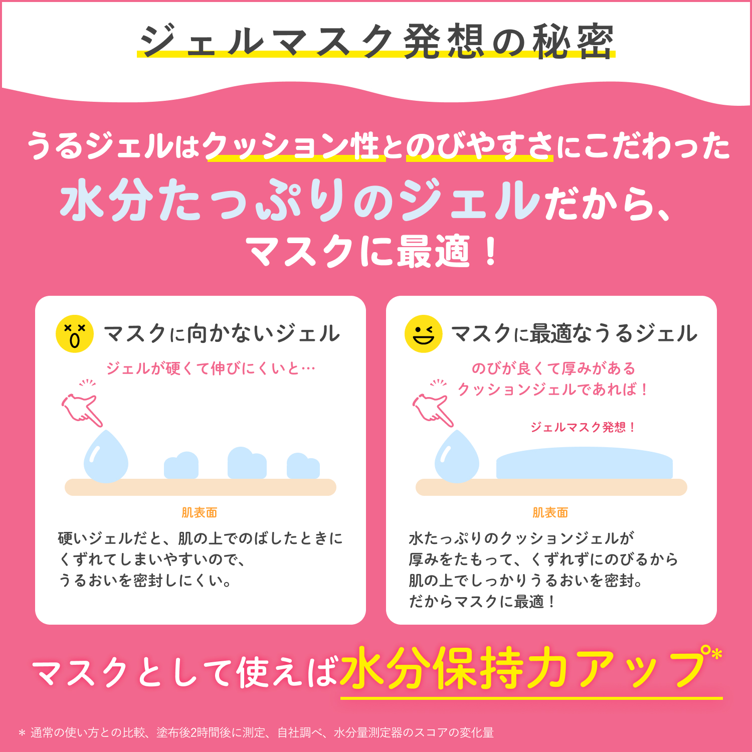 - 【水分たっぷりジェルマスク発想】うるジェルは “クッション性” と “のびやすさ“ にこだわった ”水分たっぷりジェル”でしっかりうるおいを密封するから、マスクとして使用するのがおすすめ!べたつかず、もっちりとした使用感で、不快感なくマスク使いが可能です。