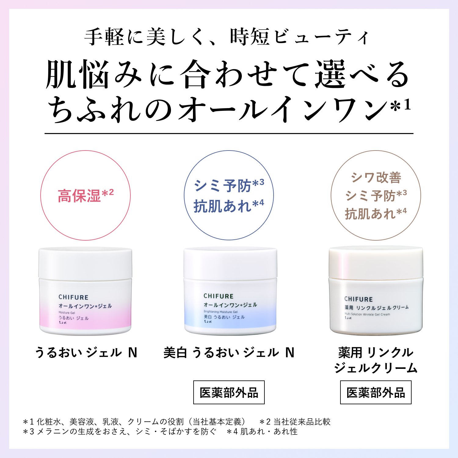 *1 ちふれ うるおいジェル(本体・詰替用・大容量チューブタイプ)、ちふれ 美白うるおいジェル(本体・詰替用)、ちふれ 薬用リンクルジェルクリーム(本体・詰替用)計7種