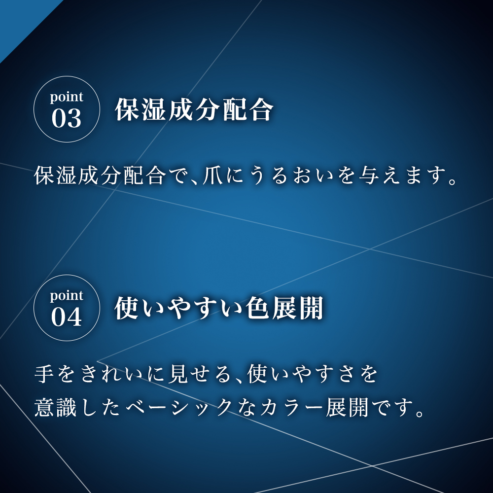 • 一度ぬりでもしっかり爪をカバーでき、高発色と高輝度感をかなえます。