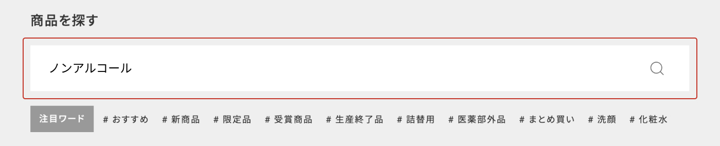 ノンアルコール商品をお探しの場合は、検索機能のご使用をおすすめいたします。「ノンアルコール」で検索いただきますと、ノンアルコールに該当する商品が表示されます。その他、「詰替用」「医薬部外品」なども検索いただけます。