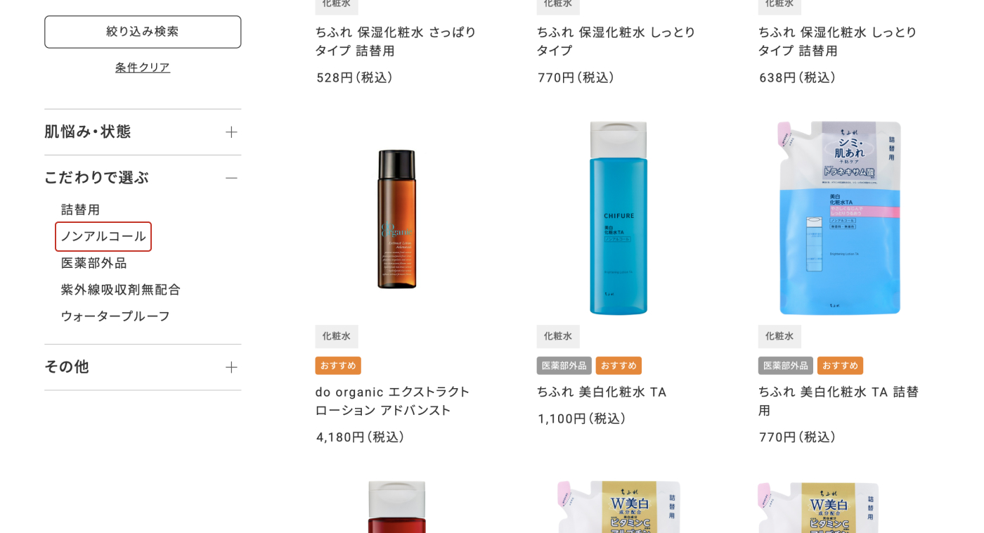 商品一覧をご覧いただく際、絞り込み機能を活用いただくと「化粧水」×「ちふれ」、「美容液」×「2,001円~3,000円」などの掛け合わせ検索が可能です。